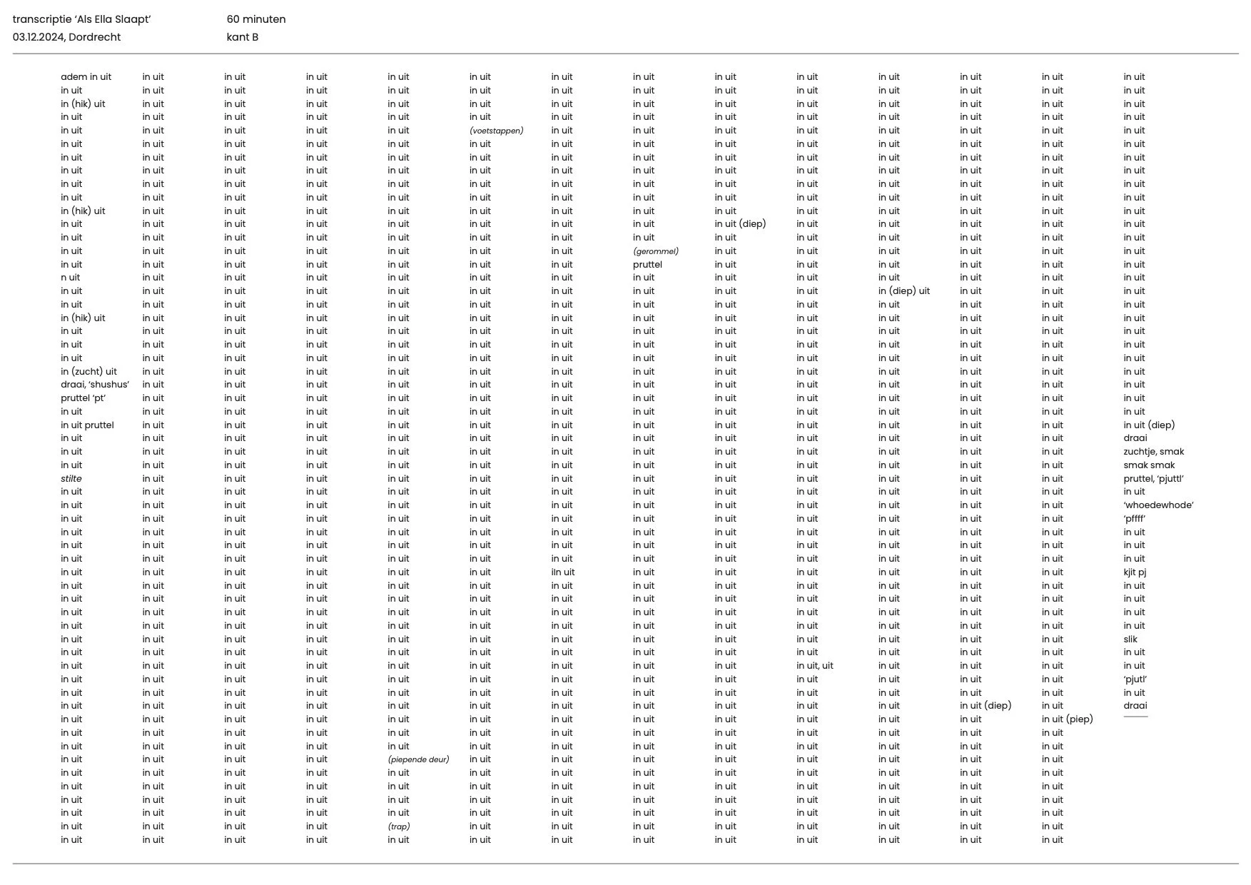 ‘Als Ella Slaapt’, wordt een serie tekst en geluid, waarvan dit de eerste is voor het project ‘nachtbrieven’ bij Museum Perron Oost, samengesteld door Kim Steur. De bovenstaande tekst is onderdeel van mijn nachtbrief.